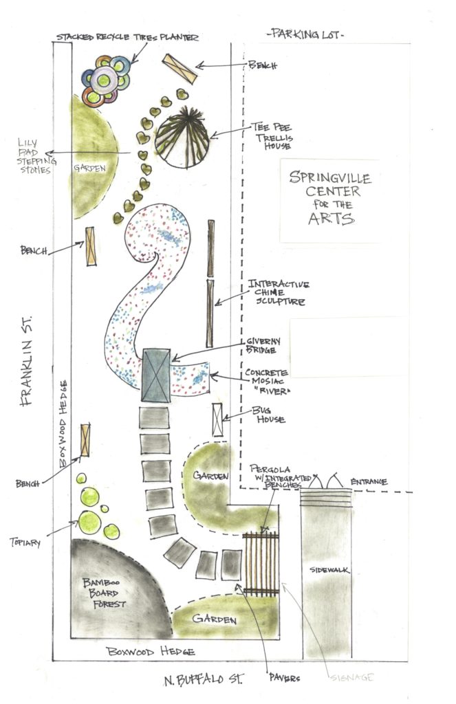 Our goal is to incorporate discoverable play and art elements targeting preschoolers through third-graders and accompany them with features or amenities for older children or adults to encourage people to pause for a moment on their way to the town hall or to get ice cream at the Dairy. The specific elements will include large scale chimes, slate pieces that can be painted on with water or chalk, hiding spaces and more. We will complete our design with community input and the assistance of a designer Joy Kuebler Landscape Architect, PC.